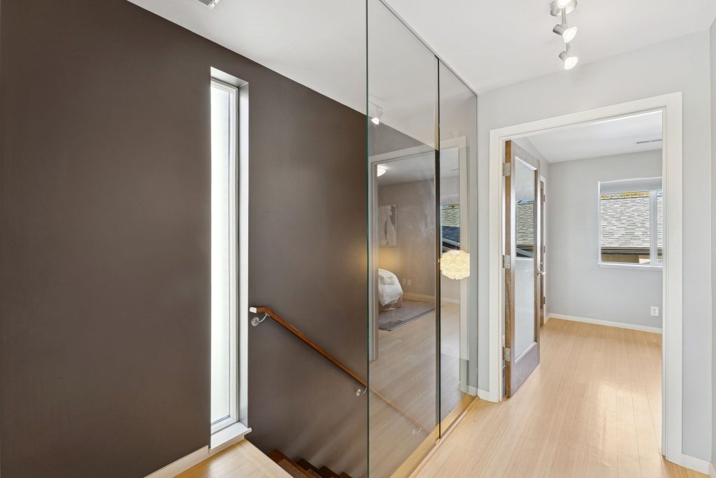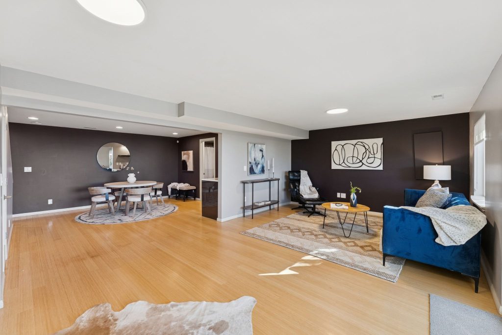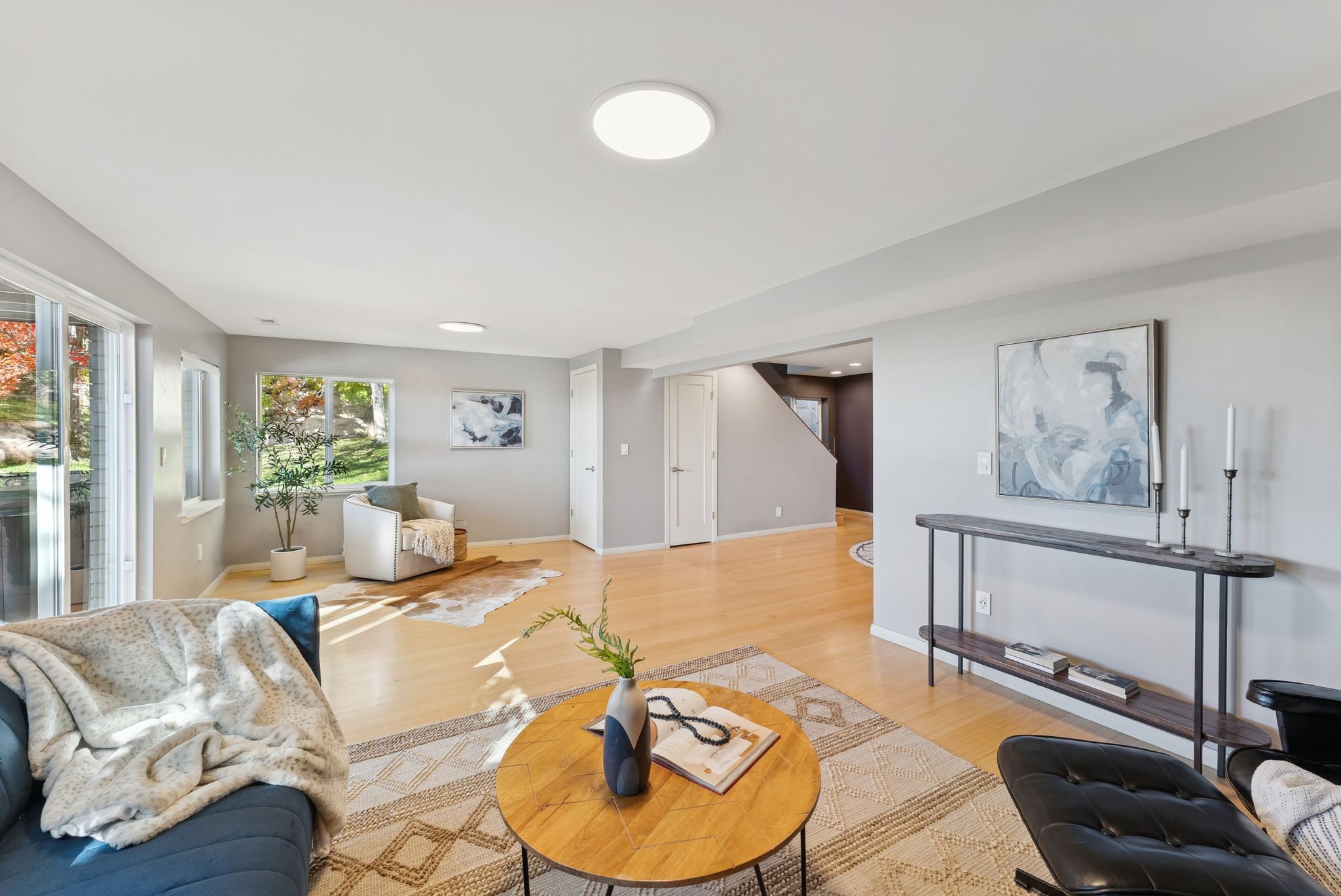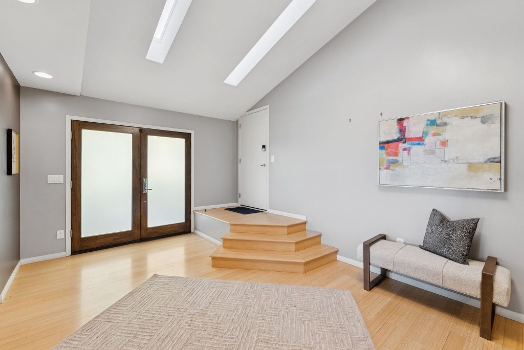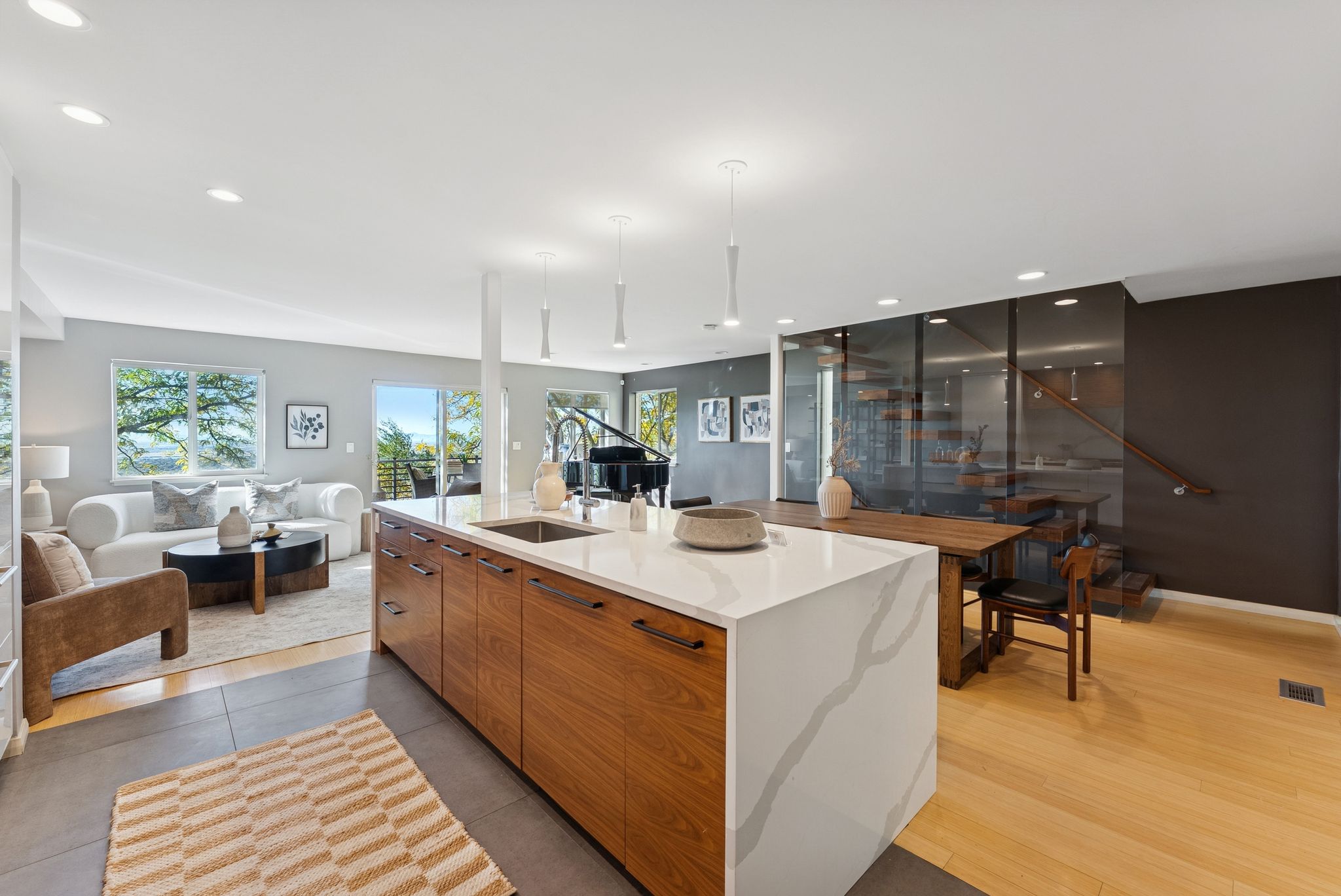 The open-concept floor plan is ideal for entertaining, featuring a vaulted foyer that leads into a newer gourmet kitchen. The kitchen is appointed with a Wolf range, built-in Sub-Zero refrigeration, custom cabinetry, and a quartz waterfall countertop. A floating staircase and generous living area with expansive western views of the Great Salt Lake complete the main living space.